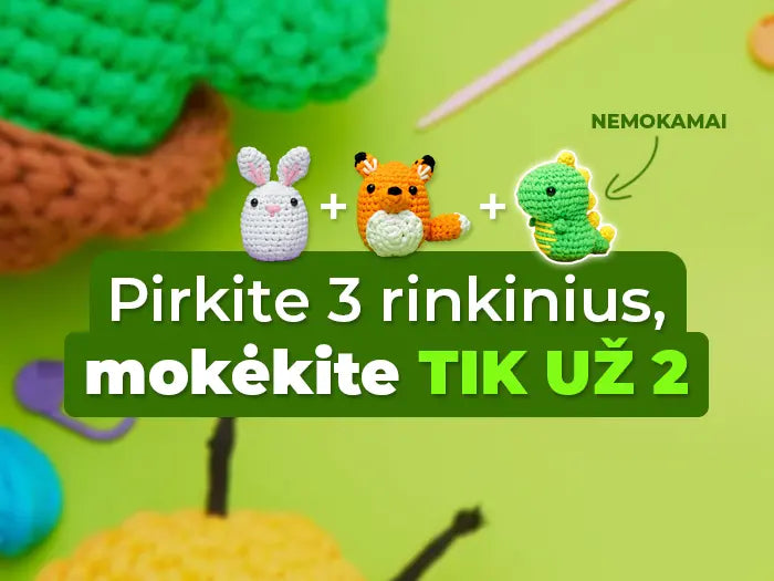 Kiekviename rinkinyje rasite vašelį, siūlą, vatos ir nunertą pradžios dalelę, kad patirtis būtų malonesnė.