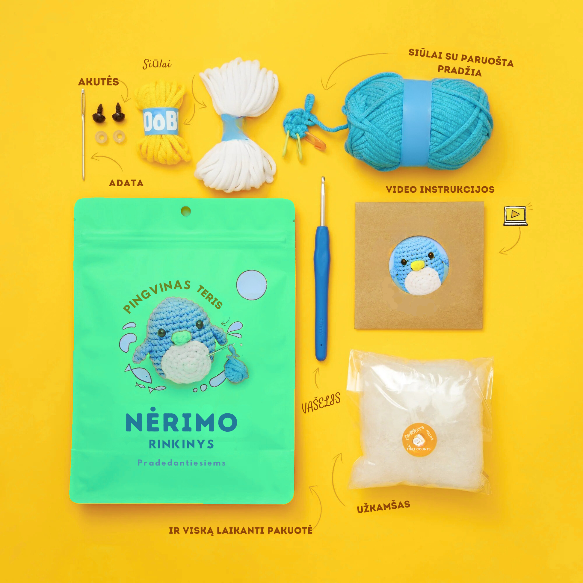 Rinkinyje yra viskas: siūlai, nėrimo vąšelis, užpildas, akytės, siuvimo adata ir net smulkmenos užbaigimui. Tau nereikės nieko papildomai pirkti – gali pradėti vos tik atidaręs pakuotę.